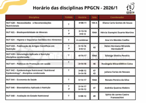 Horário das disciplinas do PPGCN que serão oferecidas no seemstre 2026/1